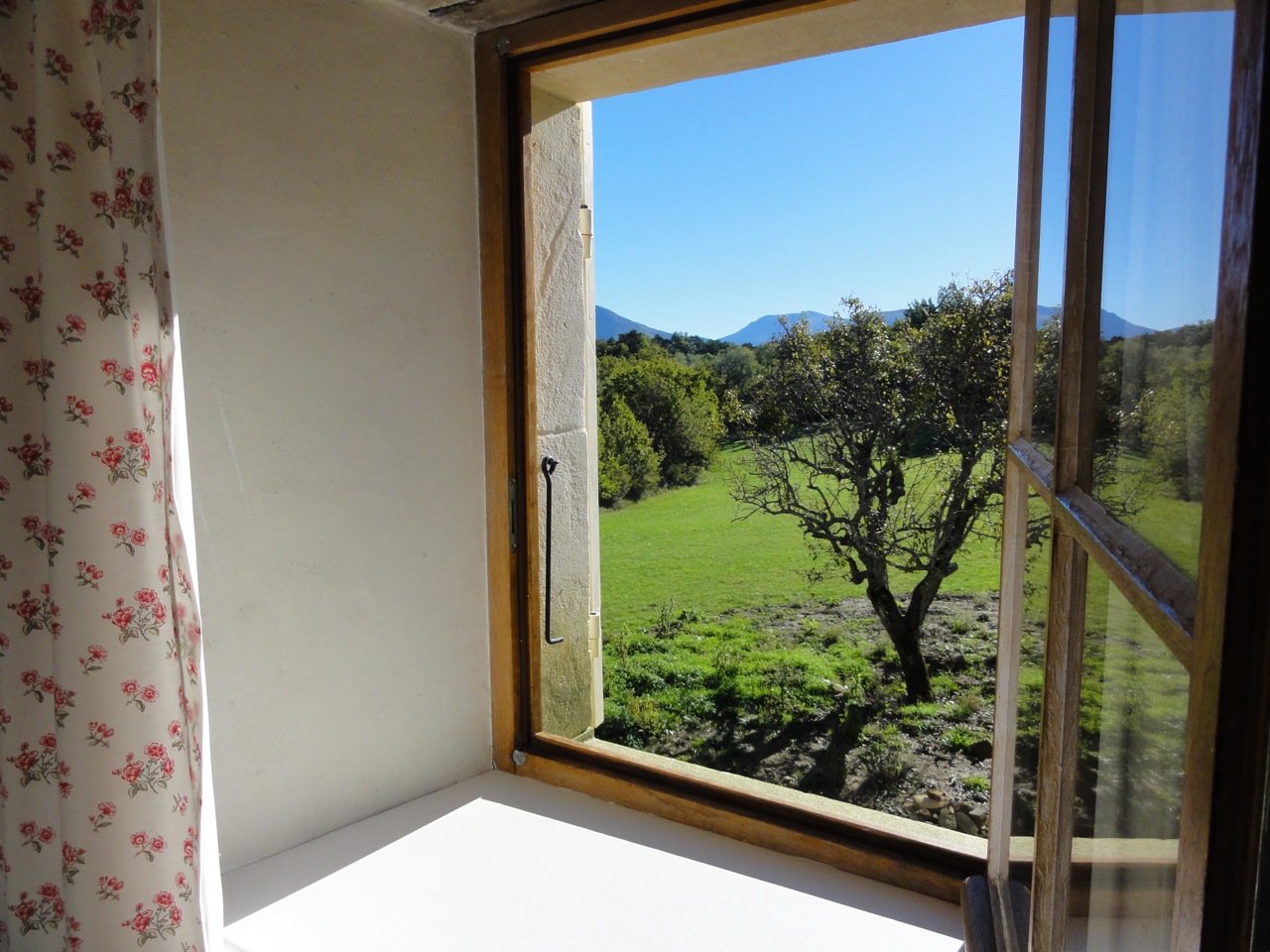 Au rez-de-chaussée, la salle à manger avec une grande double porte-fenêtre donne de plain-pied sur une terrasse avec treille pour prendre ses repas dehors avec vue imprenable sur les montagnes et quatre hectares de prairies vallonnées.