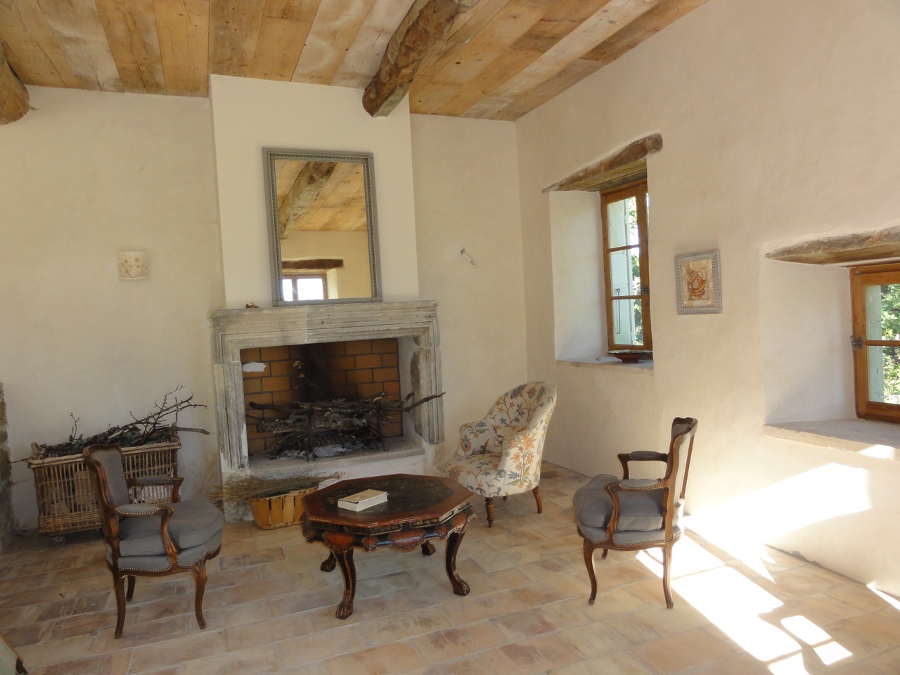 Le salon est séparé de la pièce à vivre par quelques marches et a un accès direct au jardin. Une grande cheminée ancienne permet les soirées au coin du feu